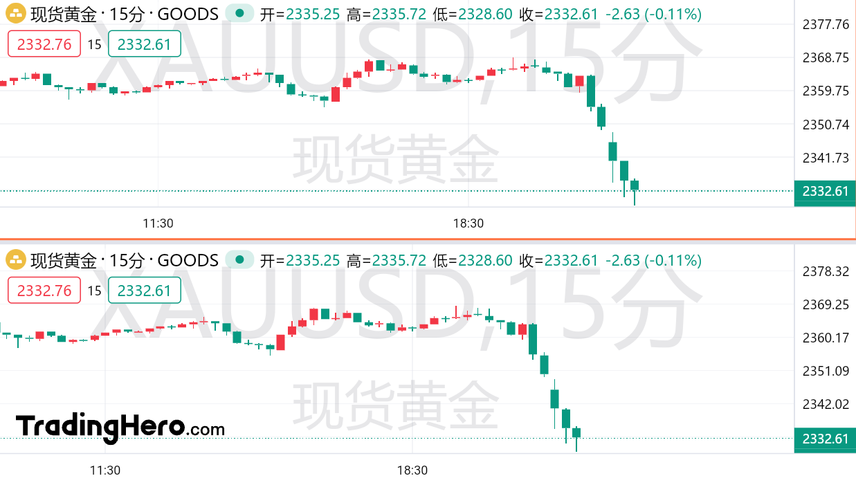 美国制造业和服务业PMI数据公布后,现货黄金短线跳水,并持续走低,日内跌幅超过1%,一度失守2330美元关口。现货白银跌破30大关后跌势仍不止,日内走低逾3%。