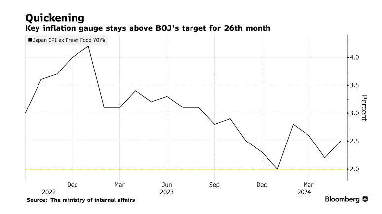 日本内务省周五表示,5月份不包括新鲜食品的核心消费者价格指数(CPI)同比上涨2.5%,高于4月份的2.2%,略低于经济学家的预期,但连续第26个月保持在或高于日本央行2%的目标水平。上涨14.7%的电价是通胀的主要贡献者。