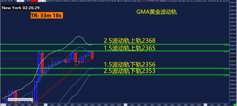 60分钟GMA-黄金波动轨指标关键点位2353、2356、2365、2368,可以关注这些位置附近的波动轨变化。黄金波动轨是依据波动率计算测算出来的,在震荡行情用法为触轨即可能反转!重点关注1.5倍波动轨和2.5倍波动轨位置。