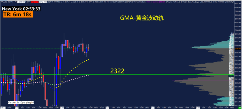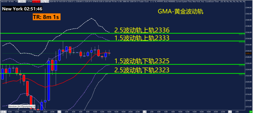 60分钟GMA-黄金波动轨指标关键点位2323、2325、2333、2336,可以关注这些位置附近的波动轨变化。黄金波动轨是依据波动率计算测算出来的,在震荡行情用法为触轨即可能反转!重点关注1.5倍波动轨和2.5倍波动轨位置。