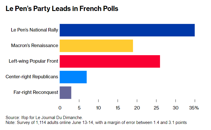 根据民调公司的预测,国民联盟党已经有望成为下议院中最大的政党,这一前景已引起投资者、法国的国际合作伙伴和部分法国公众的警惕。