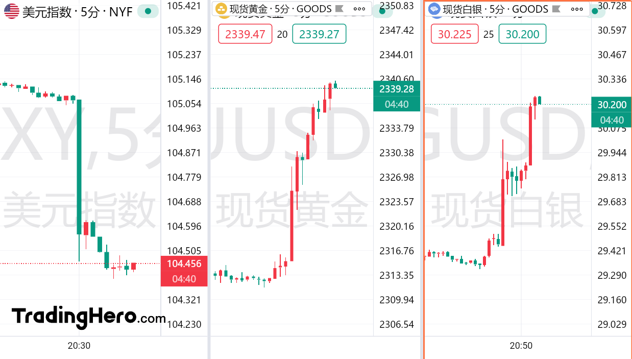 数据公布后,美元指数短线跳水60点,美国两年期国债收益率跌至4.693%,为4月5日以来最低水平。现货黄金持续走高,向上触及2340美元/盎司,日内涨幅扩大至1%。现货白银日内涨幅扩大至3%。