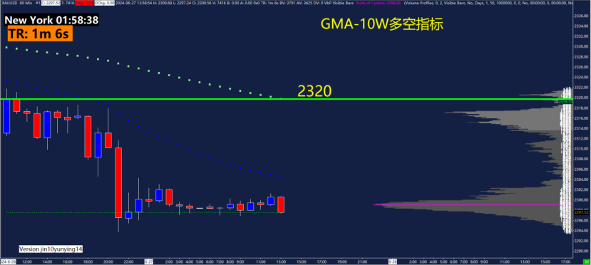 60分钟GMA-10W多空指标关键点位2320,可以关注这些位置附近的10W多空指标的变化。10W多空指标是趋势追踪指标,当快线慢线变色之后形成交叉,那么趋势得以确认。快线慢线变色的位置需要特别留意,是否存在布局机会。