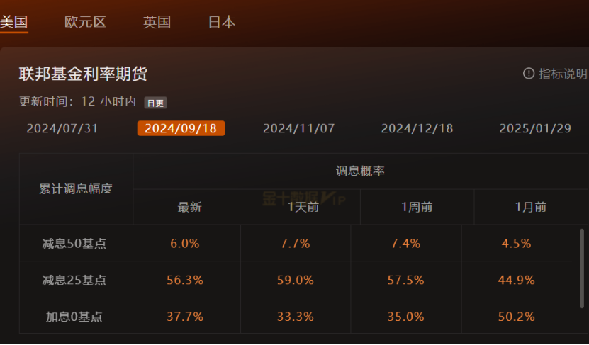 FEDWATCH显示,美联储9月降息25个基点的预期为56.3%,年底利率可能降至5%。