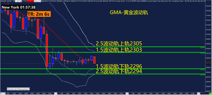 60分钟GMA-黄金波动轨指标关键点位2320、2323、2334、2338,可以关注这些位置附近的波动轨变化。黄金波动轨是依据波动率计算测算出来的,在震荡行情用法为触轨即可能反转!重点关注1.5倍波动轨和2.5倍波动轨位置。