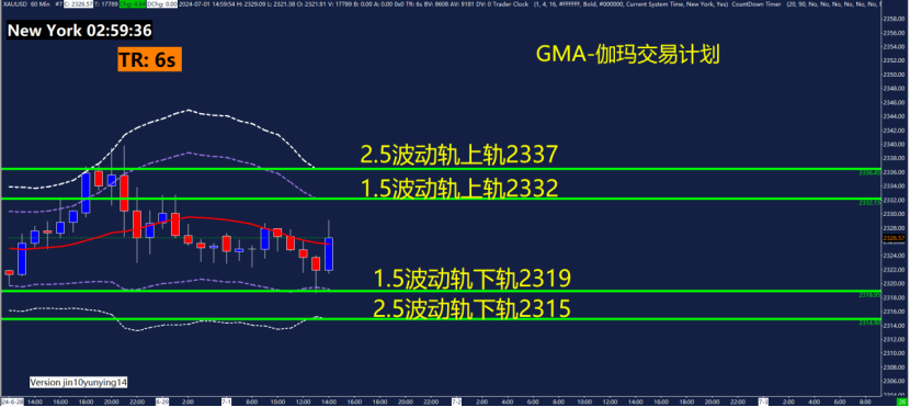 60分钟GMA-黄金波动轨指标关键点位2315、2319、2332、2337,可以关注这些位置附近的波动轨变化。黄金波动轨是依据波动率计算测算出来的,在震荡行情用法为触轨即可能反转!重点关注1.5倍波动轨和2.5倍波动轨位置。
