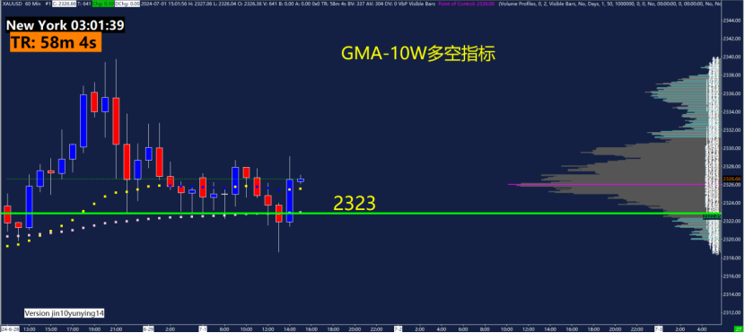 60分钟GMA-10W多空指标关键点位2323,可以关注这些位置附近的10W多空指标的变化。10W多空指标是趋势追踪指标,当快线慢线变色之后形成交叉,那么趋势得以确认。快线慢线变色的位置需要特别留意,是否存在布局机会。