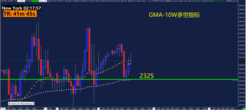 60分钟GMA-10W多空指标关键点位2325,可以关注这些位置附近的10W多空指标的变化。10W多空指标是趋势追踪指标,当快线慢线变色之后形成交叉,那么趋势得以确认。快线慢线变色的位置需要特别留意,是否存在布局机会。