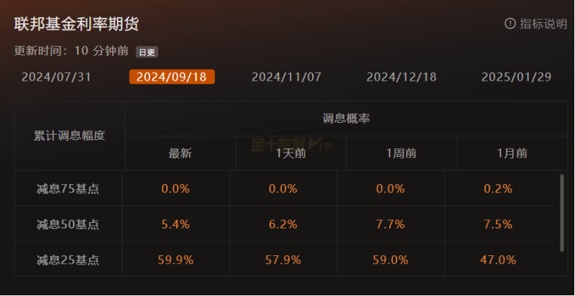 FEDWATCH显示,美联储9月降息25个基点的预期为59.9%,年底利率可能降至5%。