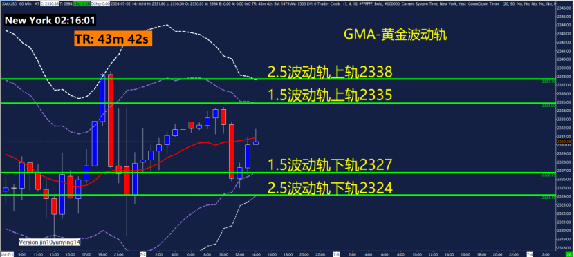 60分钟GMA-黄金波动轨指标关键点位2324、2327、2335、2338,可以关注这些位置附近的波动轨变化。黄金波动轨是依据波动率计算测算出来的,在震荡行情用法为触轨即可能反转!重点关注1.5倍波动轨和2.5倍波动轨位置。
