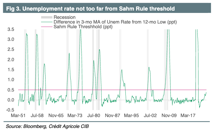法国农业信贷银行继续预计,就业市场未来会逐步降温,失业率将逐渐升至2025年中期的4.5%左右。也就是说,贝弗里奇曲线的形状表明,进一步的就业降温可能会导致更多裁员,而不是仅仅通过减少职位空缺来实现,这可能会导致失业率更快上升。此前美联储主席鲍威尔称失业率将维持在4%,而且认为这仍是很低的水平。