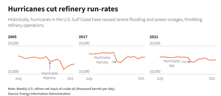 每年6月到11月的大西洋飓风季节都会对美国炼油厂造成威胁。美国每天超过1800万桶的炼油能力有一半位于墨西哥湾沿岸,极易受到飓风的影响。美国是世界上最大的燃料市场。