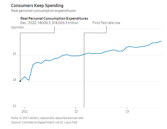 消费:自美联储去年3月开始加息以来,家庭消费强劲增长。