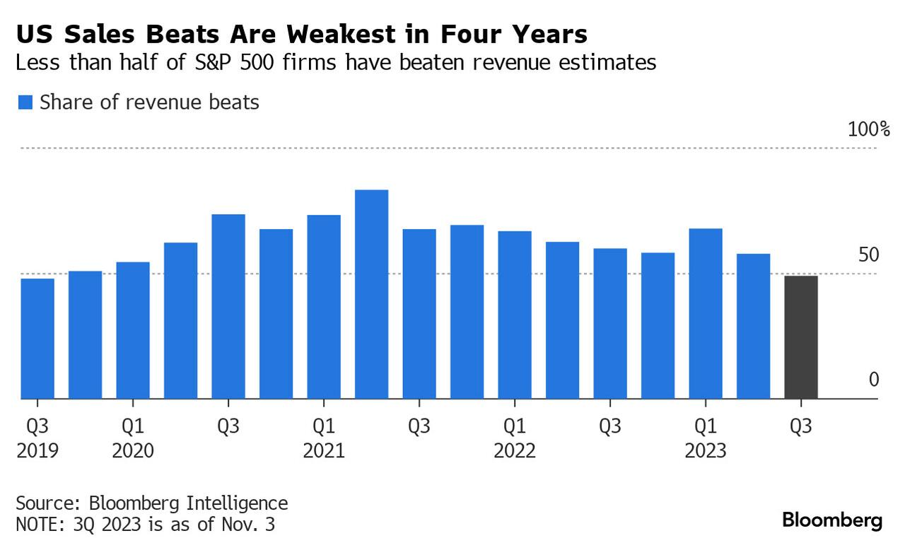 根据外媒汇编的数据,超过80%的标普500指数(SPX)的成分股公司已经公布了财报,但不到一半的公司第三季度的收入超过了预期,这是自2019年同期以来的最低比例。德意志银行的策略师表示,全球销售增长速度也已放缓至“疫情前区间的低端”。