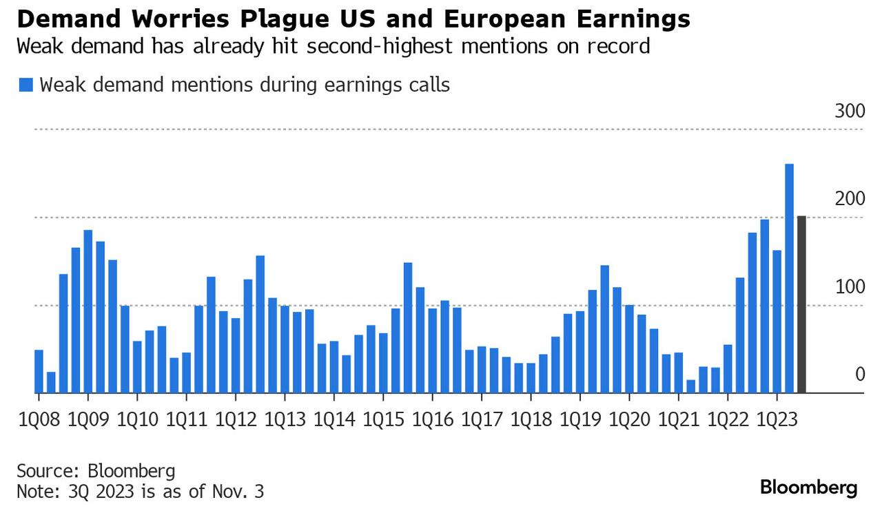 外媒对财报电话会议纪录的分析显示,“需求疲弱”是美国和欧洲企业最热门的短语之一。目前仍有20%的公司未公布业绩,这是自2000年有记录以来的第二高水平。