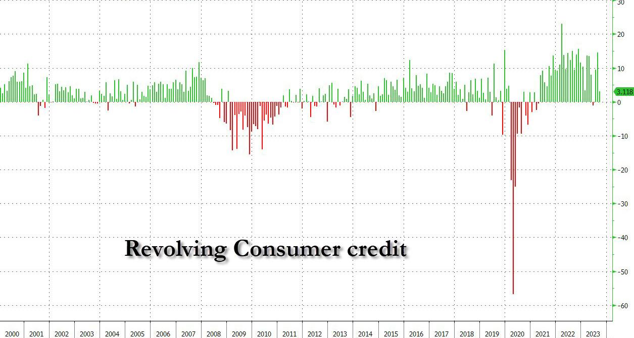 由于创纪录的高利率,消费者越来越不愿意刷爆信用卡,而与此同时,美国个人储蓄率已经崩溃,在短短几个月内从5%以上降至3.4%(2022年以来的最低水平)。