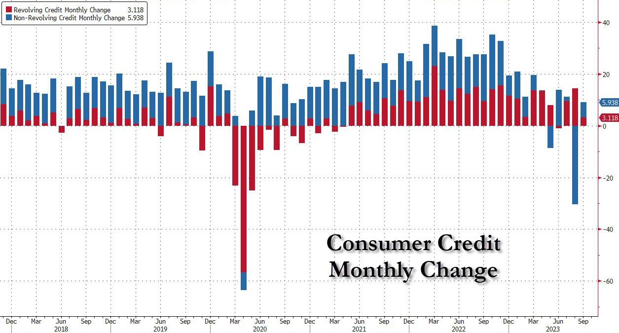 美联储周二公布的数据显示,美国9月消费者借款仅增加91亿美元,虽然较此前一个月的暴跌156亿美元(主要反映出与拜登政府免除学生贷款有关的非循环信贷出现了创纪录的下滑)有所改善,但不仅未达到95亿美元的共识预期,而且较近几个月200至300亿美元的月度增幅明显放缓。