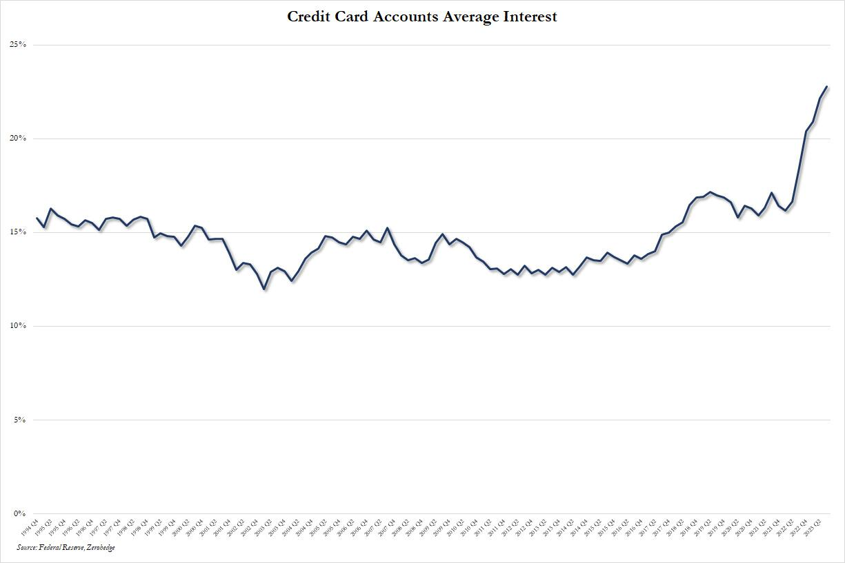美国消费者信贷的放缓,尤其是信用卡债务的放缓并不令人意外,因为正如美联储报告指出的那样,9月份美国金融机构的信用卡平均利率刚刚创下22.77%的历史新高。