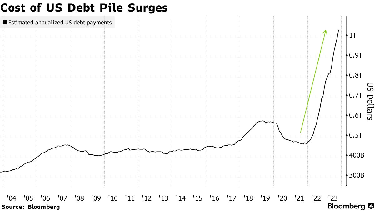 分析显示,上个月底,美国政府债务的年化利息支出估计已超过1万亿美元。这一数字在过去19个月里翻了一番,相当于2022财年联邦预算的15.9%。