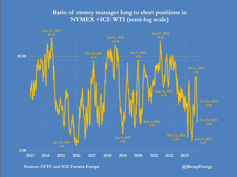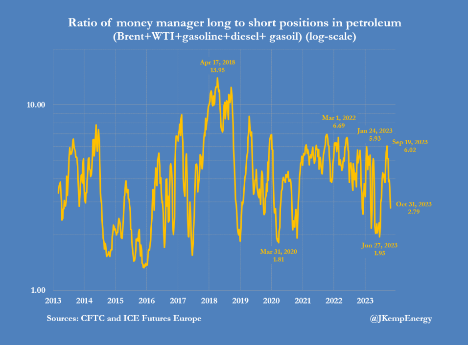 截至10月31日,总持仓从9月19日的6.8亿桶(2013年以来所有周的第64百分位)降至4.06亿桶(第18个百分位)。
