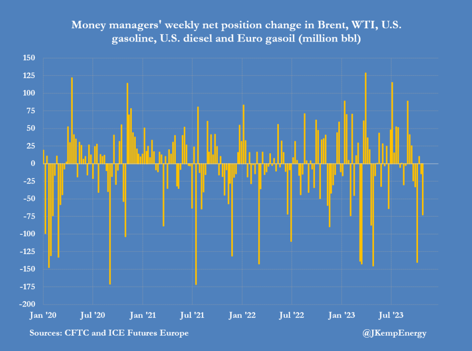 由于经济前景恶化,加上中东冲突扩大的风险似乎得到了控制,投资者连续第二周抛售原油期货和期权。