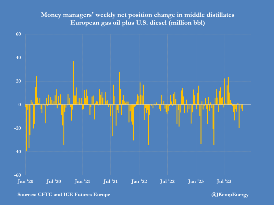 最近几周,对冲基金对柴油和其它馏分油价格前景的看法也越来越悲观。